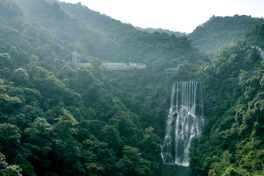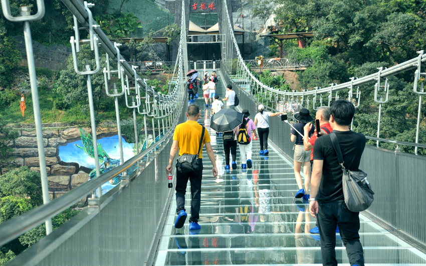 兩小時的小北江之游,大家都還余味未盡。導游又帶上大家趕往這次團建活動的重頭戲的目的地:古龍峽的“云天波霸”。今天公司參加團建的所有員工都要挑戰目前世界上較寬的高空玻璃橋,玻璃橋像一條通體透明的巨龍連接著峽谷兩岸,橋下懸空超過100米,站在橋上向下看,真是令人心驚膽戰,大家相互鼓勵,三三兩兩牽手前行,用相互的關愛順利通過并成功抵達世界較大直徑的懸空玻璃平臺。盡管大家都汗流浹背,但每個人臉上都洋溢著喜悅。因為此時大家都收獲了克服恐懼心理后戰勝困難的勇氣和成功!