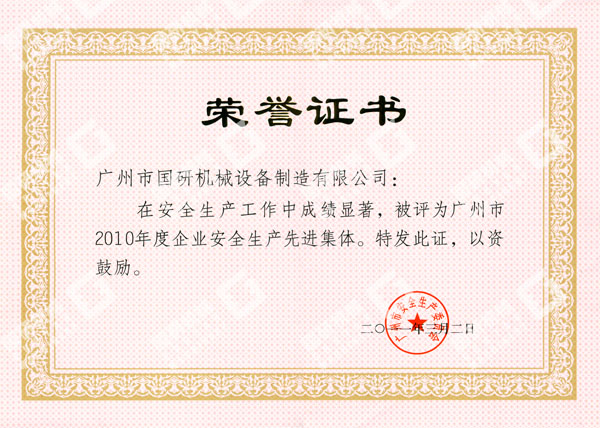 近日,在廣州市人民政府召開的安全生產(chǎn)工作總結(jié)暨表彰大會(huì)上再次傳來喜訊,廣州市國研機(jī)械設(shè)備制造有限公司被廣州市人民政府授予“廣州市2010年度企業(yè)安全生產(chǎn)先進(jìn)集體”榮譽(yù)稱號(hào)。這是我司獲得中華全國總工會(huì)和國家安全生產(chǎn)監(jiān)督管理總局授予2009年度全國“安康杯”競(jìng)賽優(yōu)勝企業(yè)稱號(hào)后,被授予的又一殊榮。