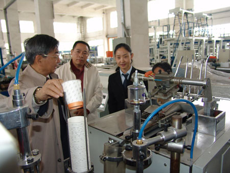 張教授一行聽取了總經理王聲位的匯報,并在公司總經理王聲位,副總經理、黨支部書記王聲躍的陪同下對我司總部、塑料機械廠、食品機械廠進行參觀指導。在塑料機械成品展廳,張教授在詳細了解塑料機械的生產工藝后,對我司塑料機器的功能頗為贊賞,對我司機器的環保性能給予了充分的肯定,并對我司產品的設計及發展方向提出了具體的要求和建議。